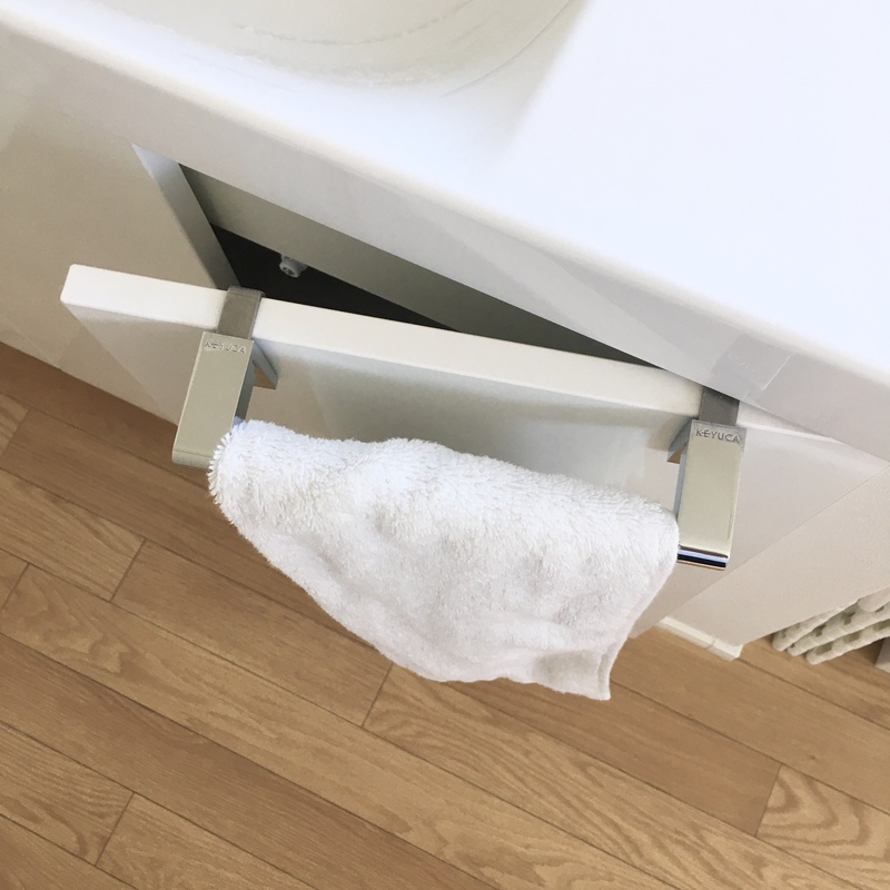 最初は壁面にタオル掛けを設置予定でしたが、子供がまだ小さく踏み台を使ってようやく洗えるくらいなので、タオルも手元にある方が良いかなと思い収納扉に設置しました。
